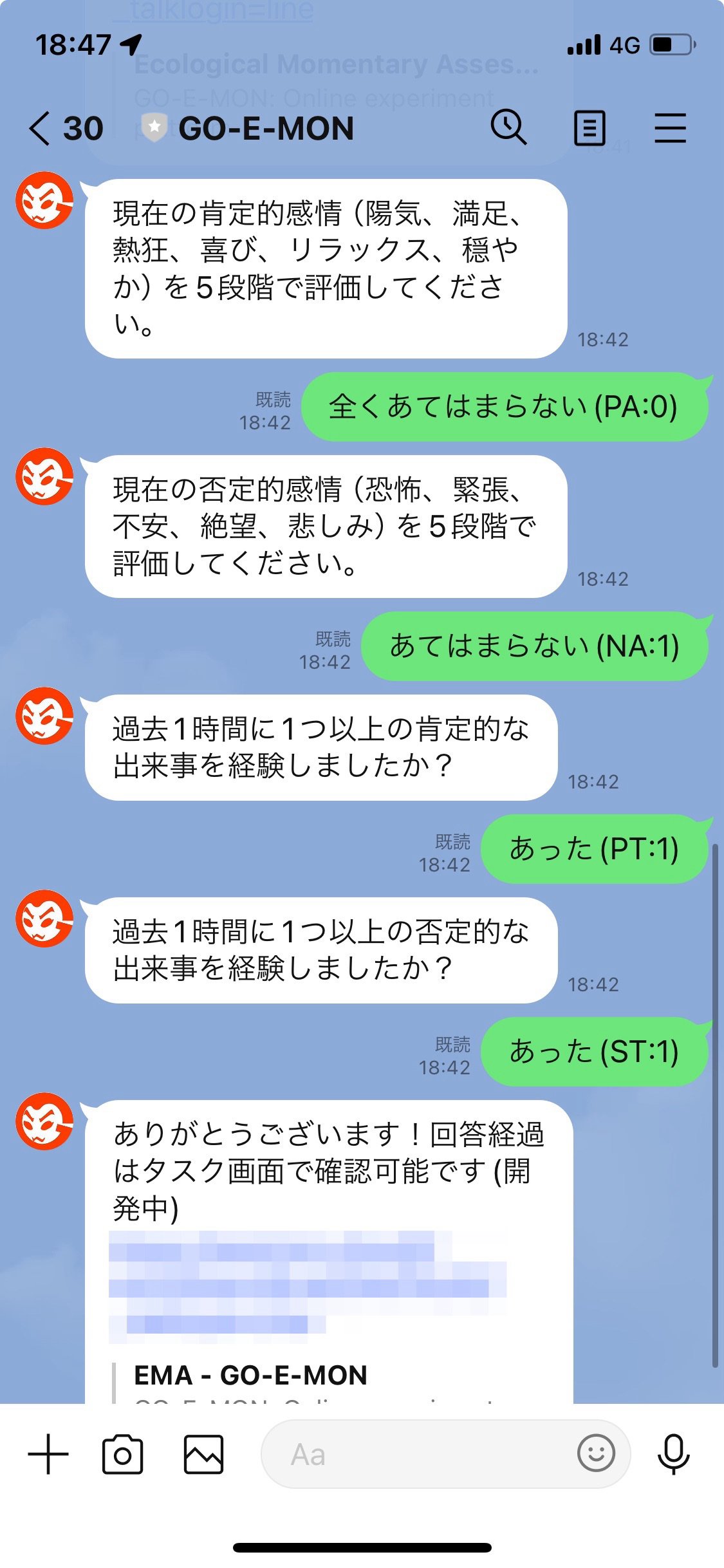このタスクは、以下の論文で紹介されている Ecological Momentary Assessment (EMA) をGO-E-MON + LINEでやってみるテストです。