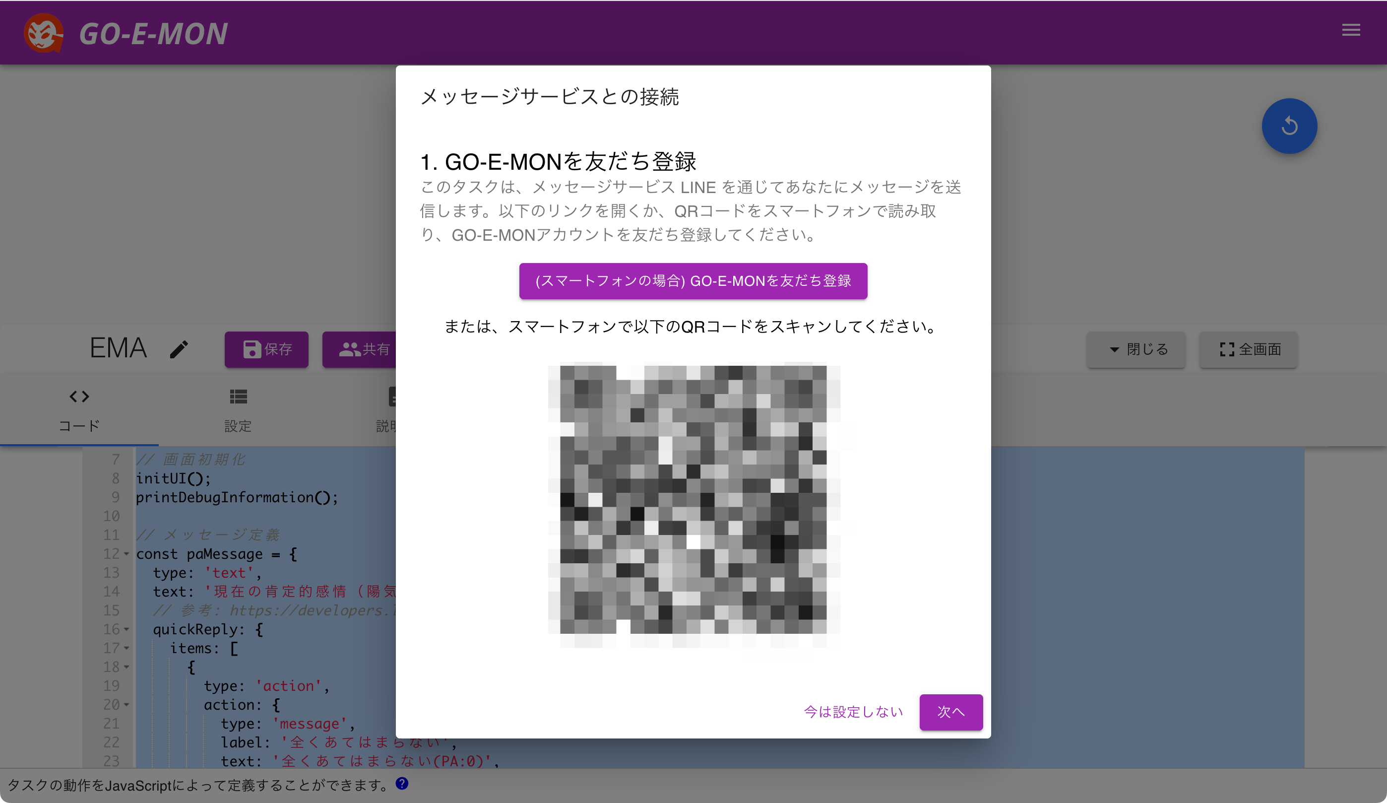 実行すると、LINEの友だち登録用のQRコードが表示されますので、LINEでGO-E-MONを友だち登録してください。