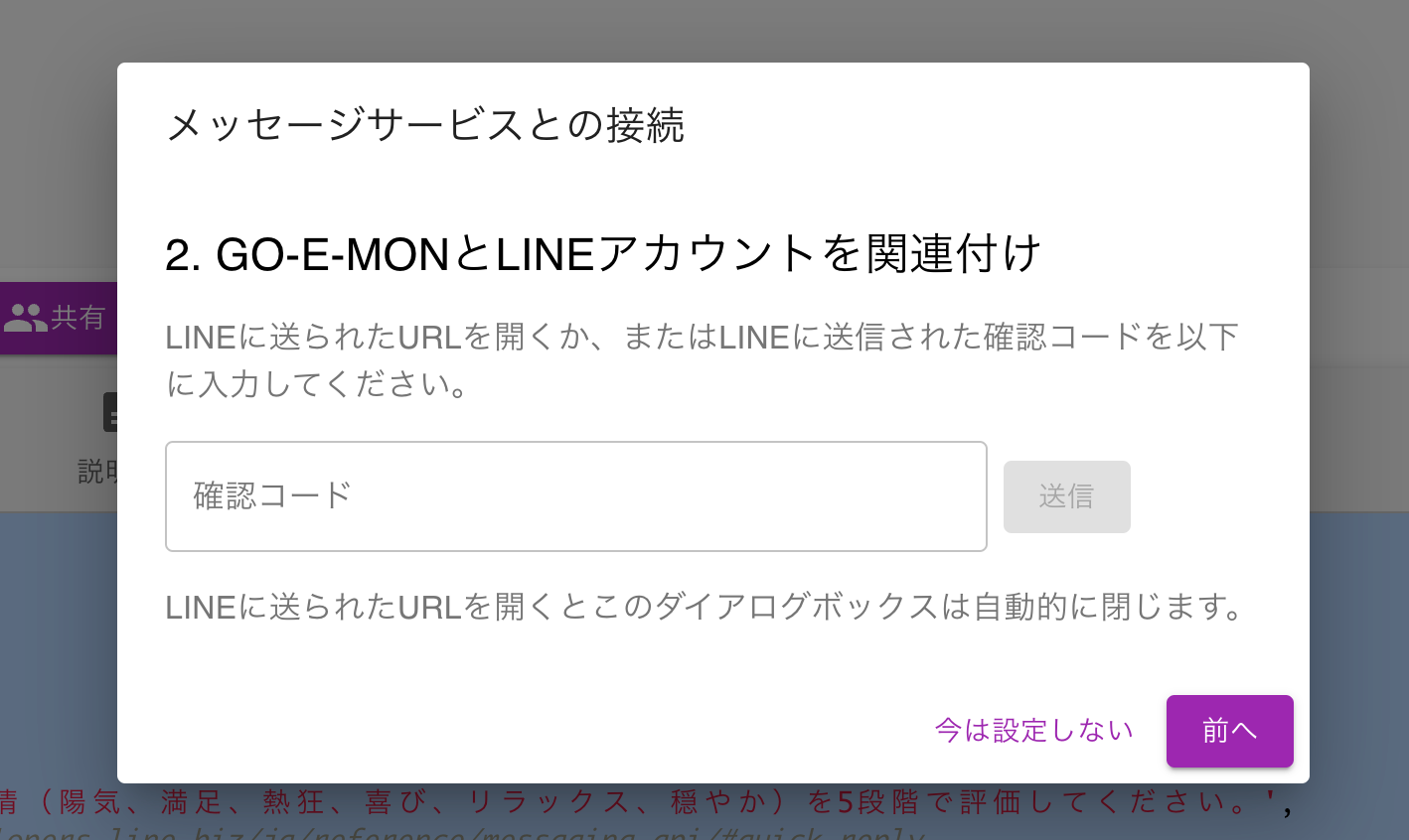 友だち登録すると、LINEに登録用のコードが送信されますので、上の画面の「次へ」をクリックして、そのコードを入力してください。