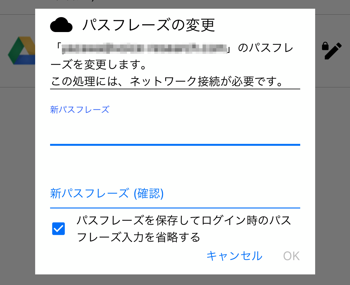 新しいバージョンのPersonaryを開くと、Googleのログインボタンが表示されるので、https://goemon.cloud を使用しているGoogleアカウントでログインする。 Googleの権限について確認がなされたのち、パスフレーズを聞かれる。この時、 古いバージョンで入力したPersonaryのパスフレーズを覚えている場合 → それを入力する。 古いバージョンで入力したPersonaryのパスフレーズを覚えていないか、入力しても失敗する場合 → 以前のパスフレーズを確認することはできないので、新たなパスフレーズを再設定する。 パスフレーズを再設定したい場合、古いバージョンのPersonaryを起動し、アカウント登録 画面を開く。 パスフレーズの編集ボタンを押す。 パスフレーズの入力を求めてくるので、新しくパスフレーズを考えて(これは忘れないようにすること)、入力する。 OKを押してパスフレーズの再設定は完了です。上記に入力したパスフレーズを新しいバージョンのPersonaryに入力して、設定を完了してください。