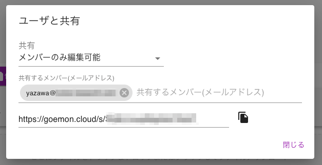 メンバーのみ編集可能を選択した場合は、共有相手としたいユーザのメールアドレス(GO-E-MONへのログインに使用しているもの)を入力してください。その後、共有したいユーザに共有URLを送り、開いてもらうようにしてください。