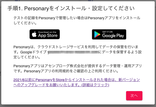 次へ ボタンを押すと、PersonaryのApp StoreまたはPlay Storeへのリンクを確認できます。