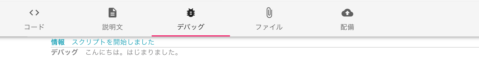 Debugger デバッグ タブではコードが出力したエラーメッセージやデバッグ出力を確認することができます。 スクリプトで以下のように記述すると、デバッグタブ内にメッセージを出力することができます。