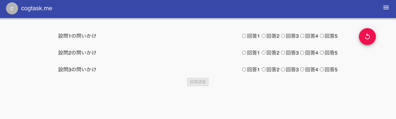 - 全ての設問を選択するまで回答送信ボタンはグレーアウト(無効化)