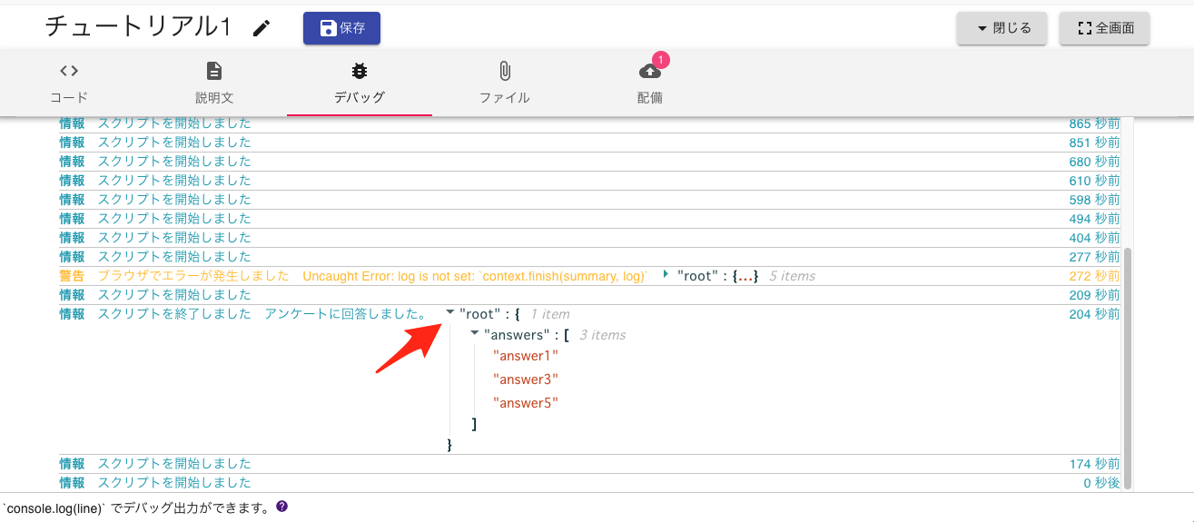 送信されたログは スクリプトを終了しました ログから内容を確認できます。 また、スクリプトの誤りなどでエラーが発生した場合は、デバッグタブから警告・エラーを確認することができます。