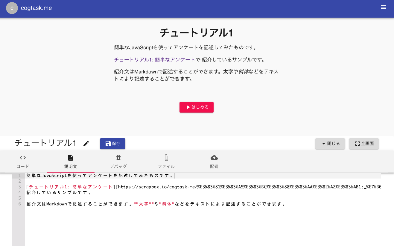 [チュートリアル1: 簡単なアンケート](https://scrapbox.io/cogtask-me/%E3%83%81%E3%83%A5%E3%83%BC%E3%83%88%E3%83%AA%E3%82%A2%E3%83%AB1:_%E7%B0%A1%E5%8D%98%E3%81%AA%E3%82%A2%E3%83%B3%E3%82%B1%E3%83%BC%E3%83%88)で