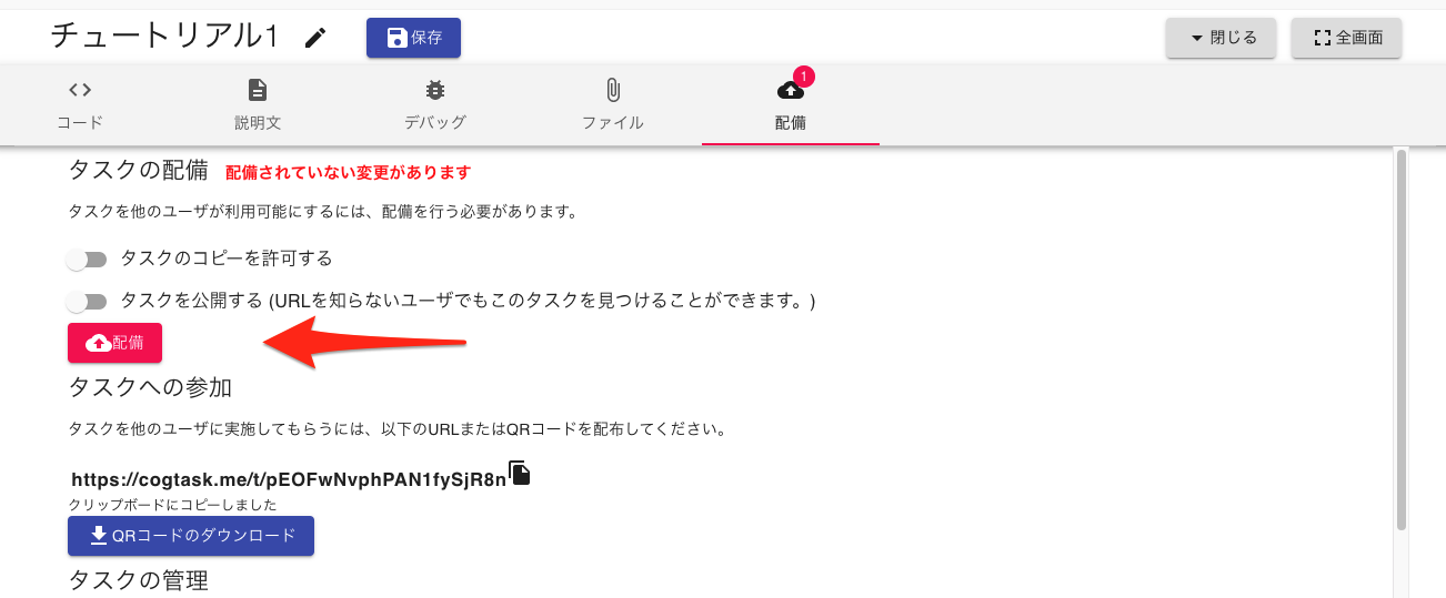 配備タブの配備ボタンを押すことで、タスク作成者以外のユーザが最新のタスクを試すことができるようになります。