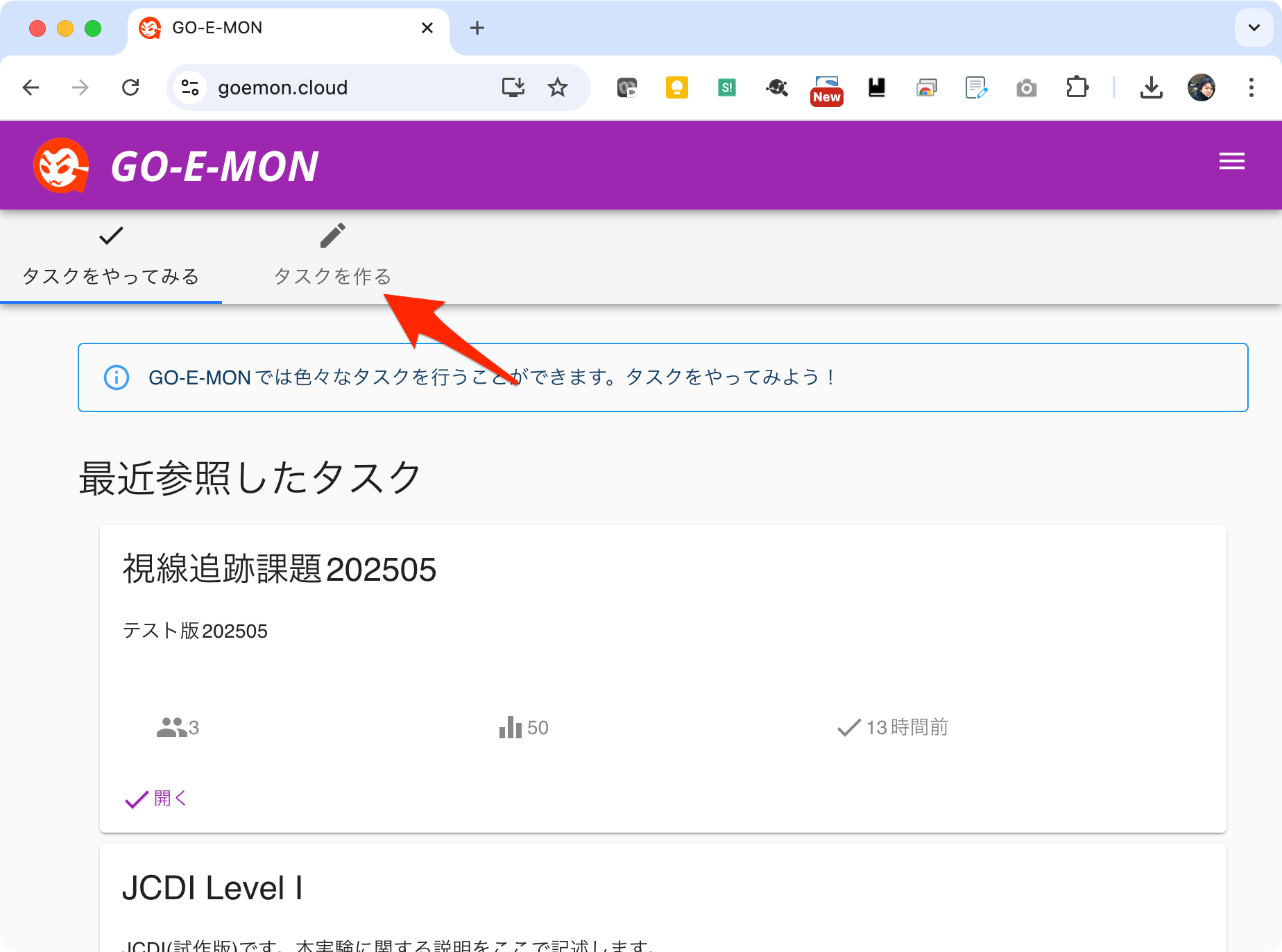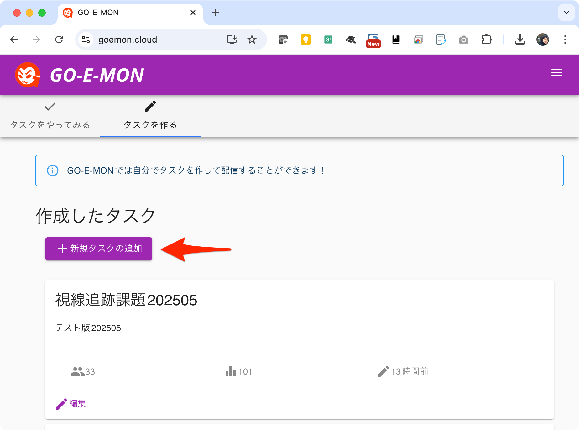 GO-E-MONダッシュボード https://goemon.cloud にアクセスし、新規タスクの追加 ボタンをクリックします。